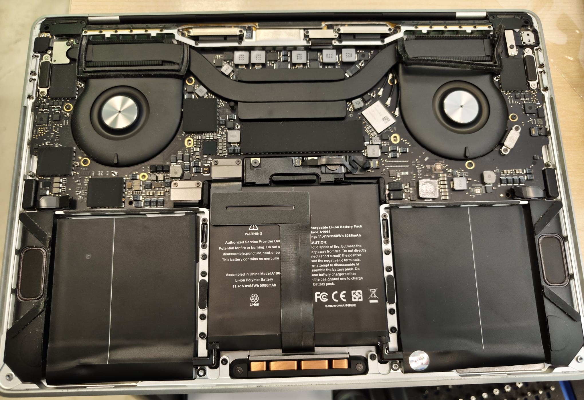 Vista interna de los componentes y celdas de batería del MacBook Pro A1989 antes de la extracción.