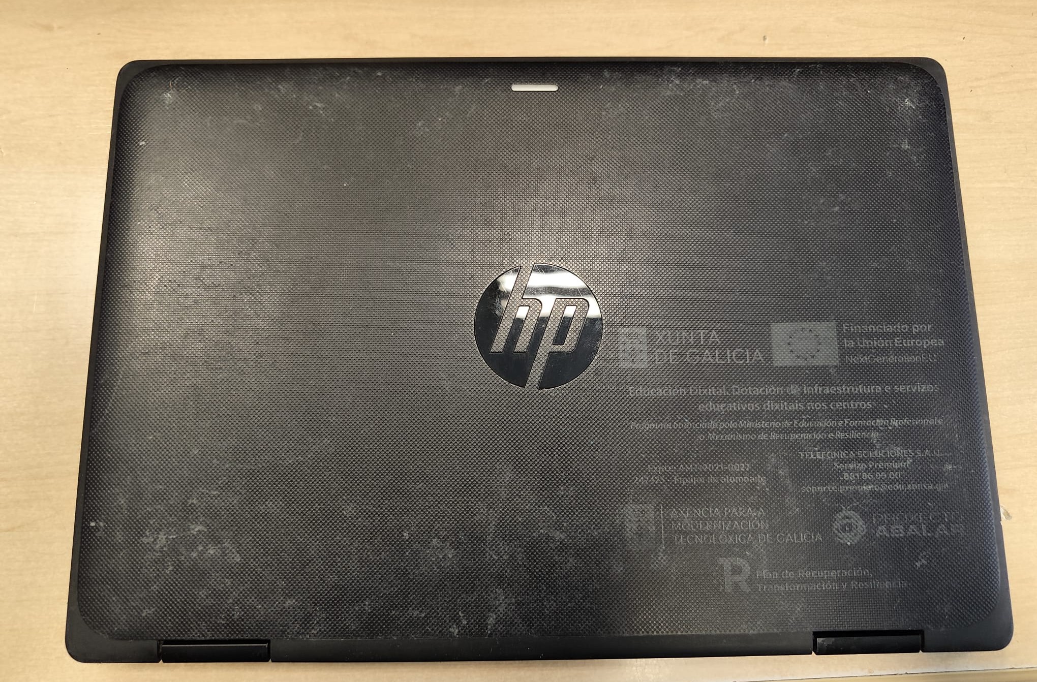 Vista posterior de la laptop HP Pro x360 con etiquetas de dotación educativa.