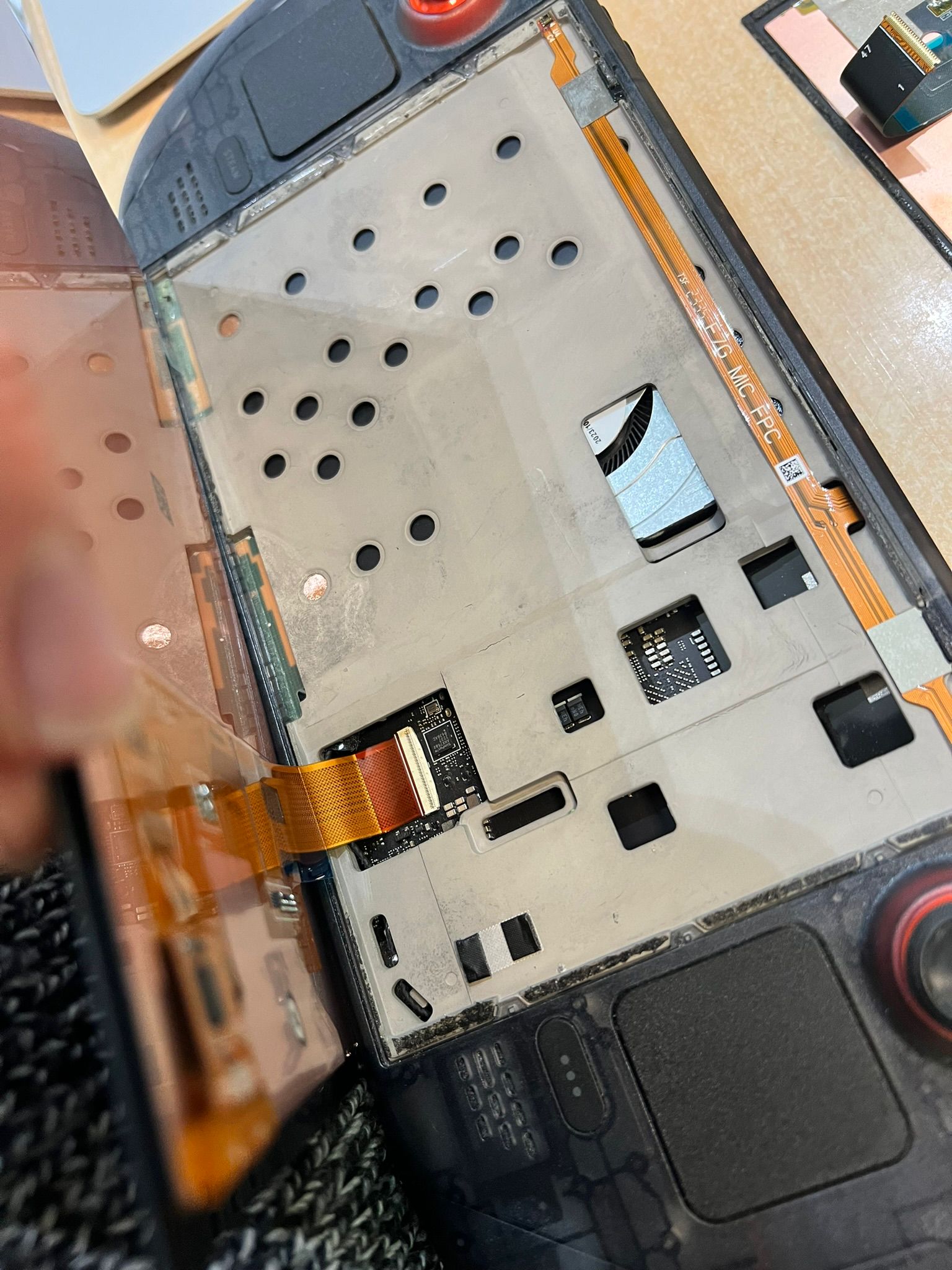 Macro de la conexión del cable flexible (flex) naranja de la pantalla a la placa base de la Steam Deck OLED dentro del blindaje metálico.