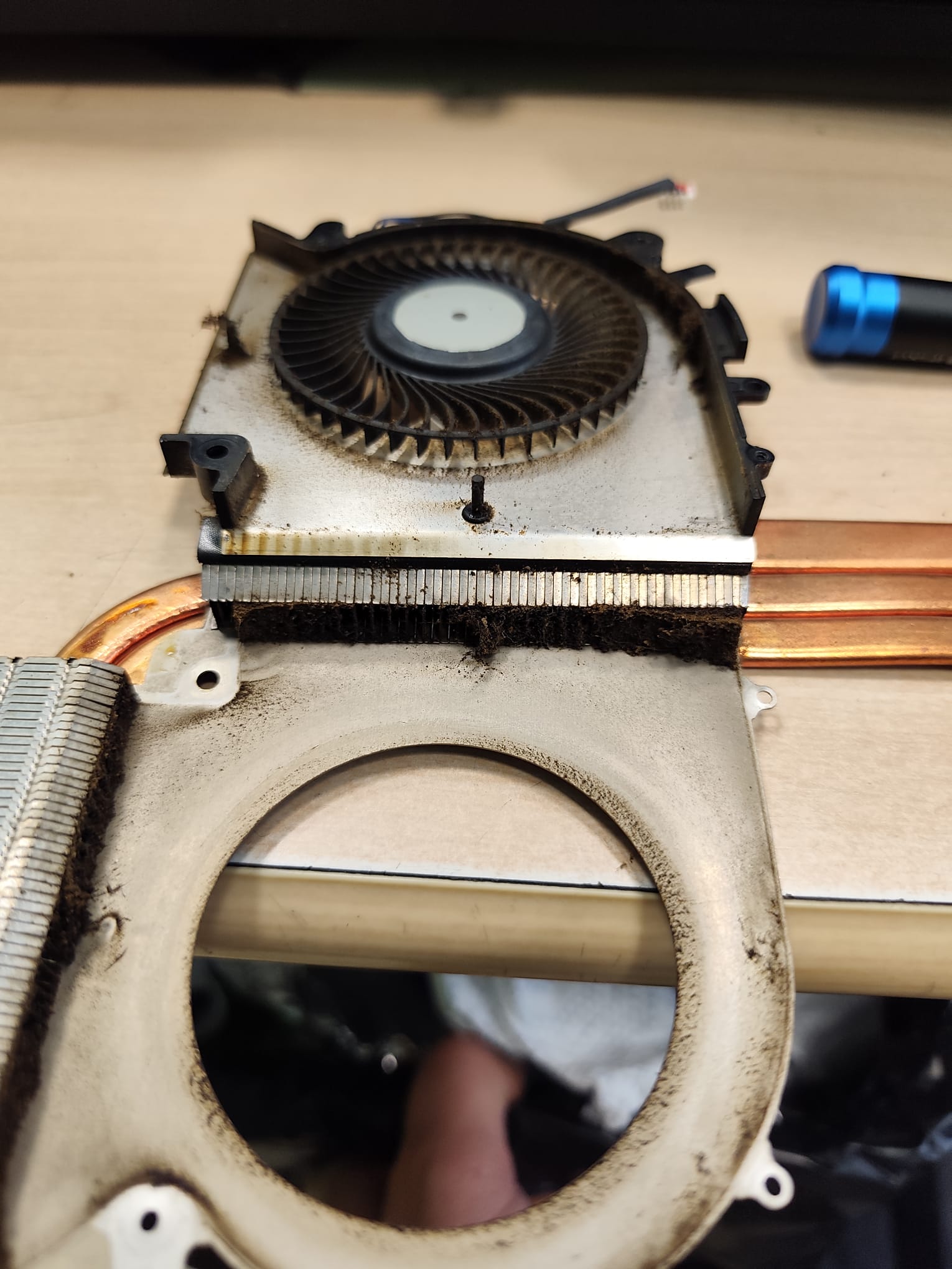Rejilla del disipador de calor bloqueada por suciedad, impidiendo la salida de aire caliente en MSI Katana.